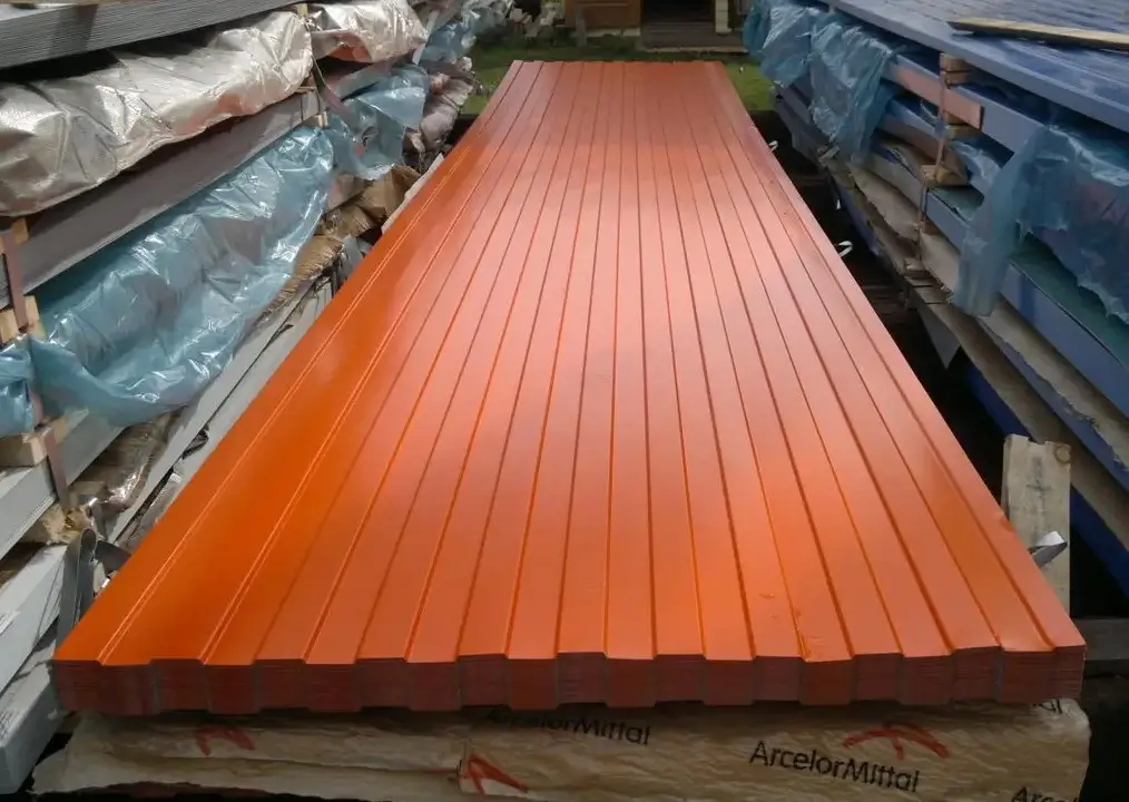 Полиэстерное покрытие RAL 2004 Чистый оранжевый придает профлисту эстетичный внешний вид и защищает его от повреждений. Оно также обладает устойчивостью к ультрафиолетовому излучению, что позволяет использовать материал на открытом воздухе без опасений о его выгорании.