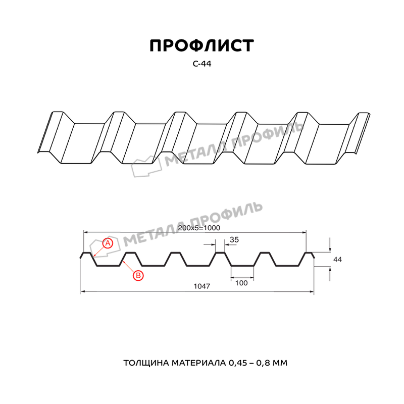 Профлист имеет форму С-44, которая обеспечивает хорошую жесткость и устойчивость к нагрузкам. Он покрыт полиэстеровой краской, которая придает ему эстетичный внешний вид и защищает от коррозии.