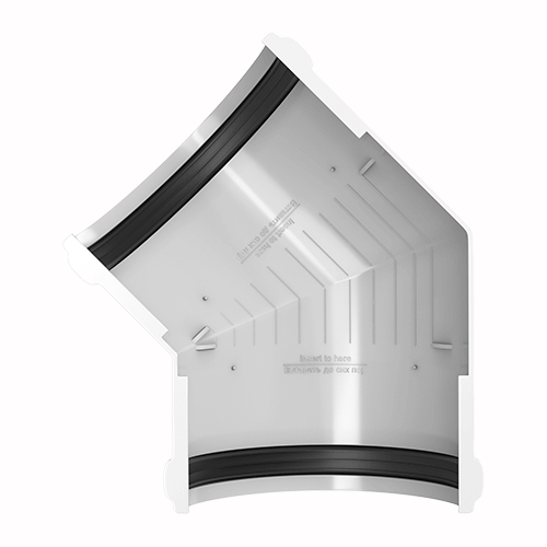 Угол желоба предназначен для соединения желобов на карнизах, которые лежат в одной плоскости, но расположены перпендикулярно относительно друг друга.